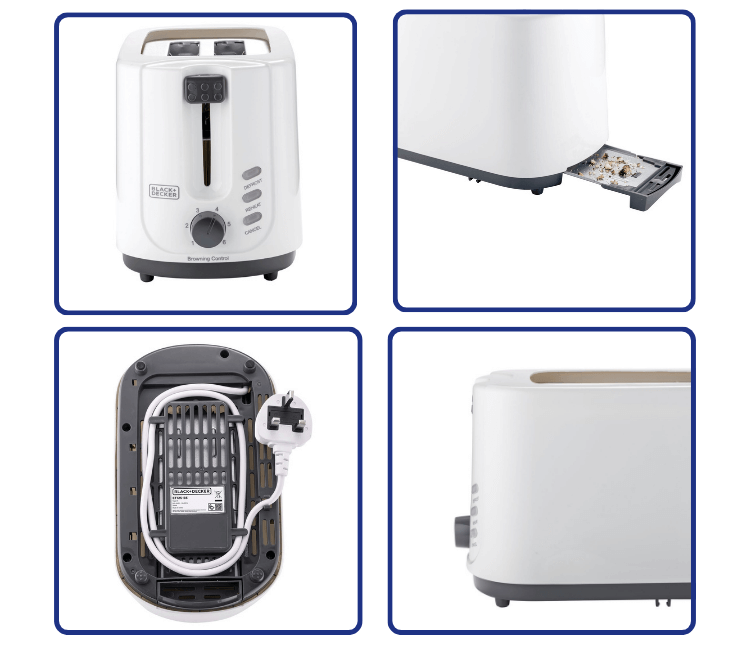 - Removable Crumb Tray: A slide-out crumb tray catches crumbs, making cleanup quick and keeping your countertop tidy.